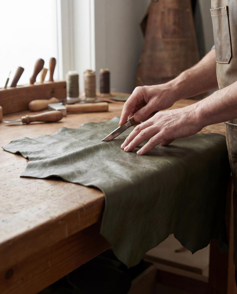 Selected and cut by zone, reinforced where it matters, finished with quiet edge discipline.