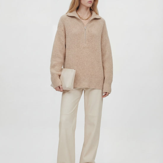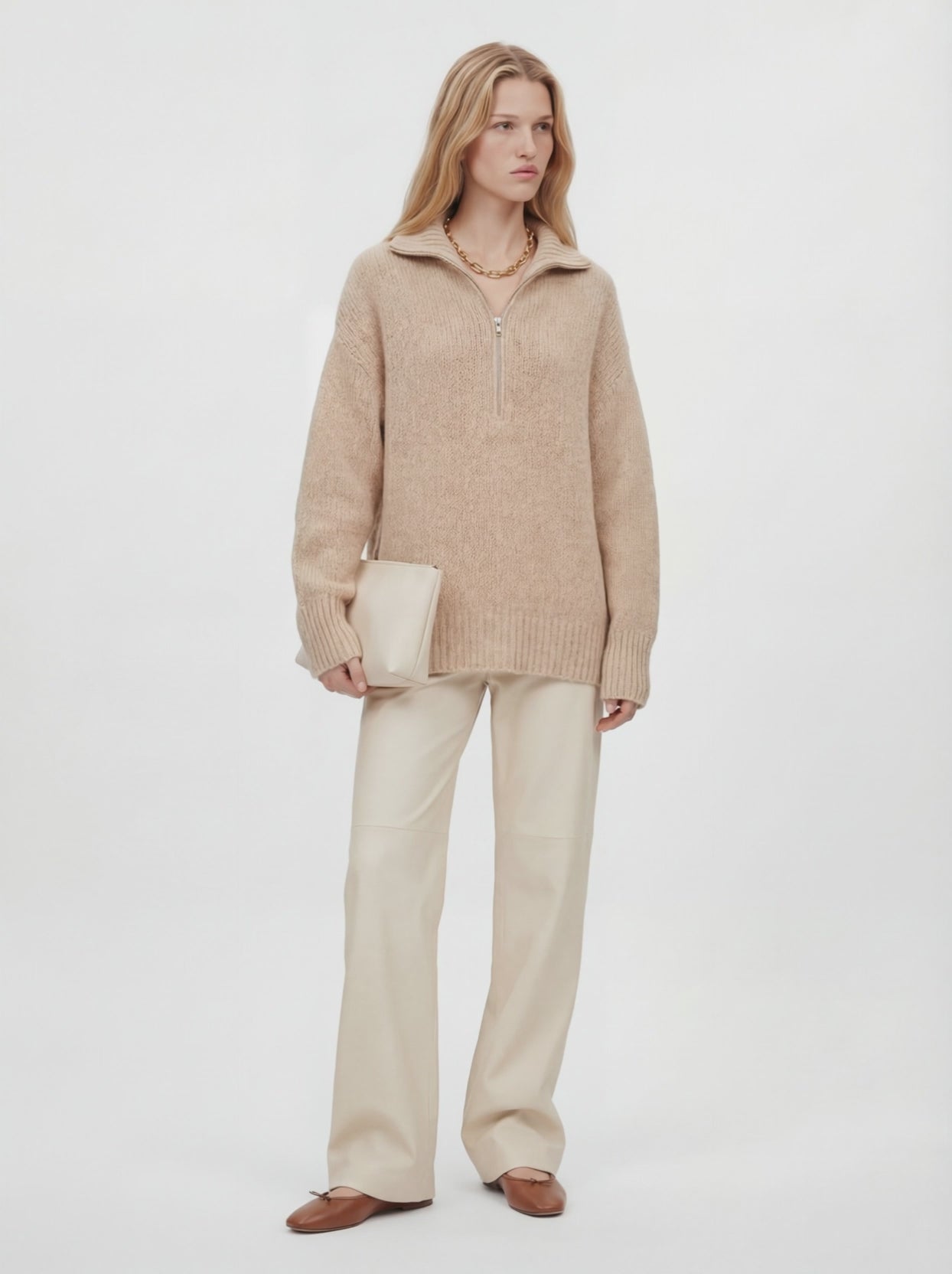 - Relaxed, slightly oversized silhouette with generous sleeves and a high collar.